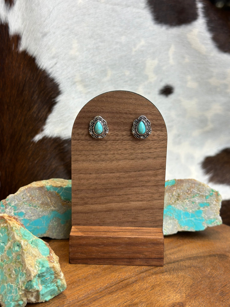 These earrings add a touch of elegance to any outfit. Made with high-quality faux turquoise stone, they provide a chic and timeless look. The sturdy stud design ensures comfort and security, making them perfect for everyday wear or special occasions. Elevate your style with these stunning earrings.