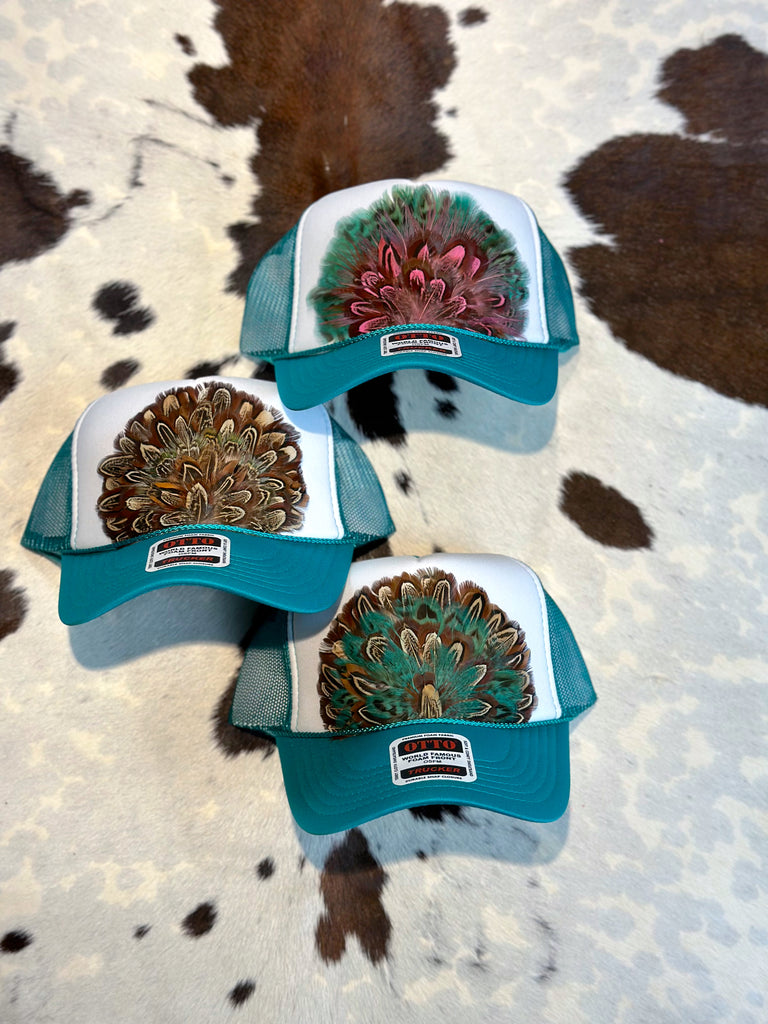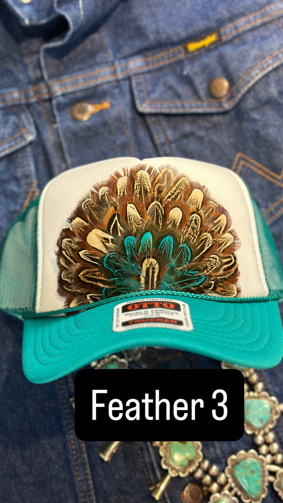 JADE AND WHITE FEATHER TRUCK HAT.