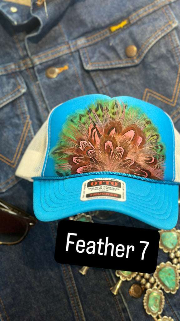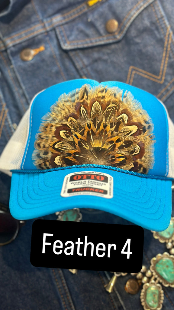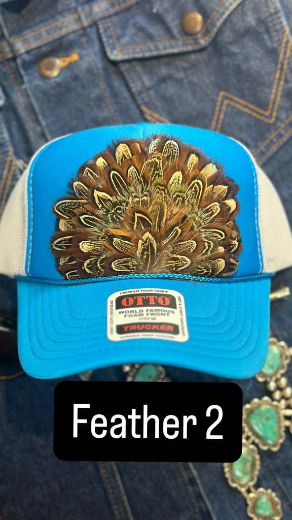 BLUE AND WHITE FEATHER TRUCKER HAT