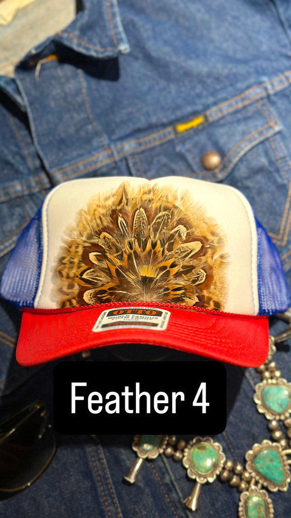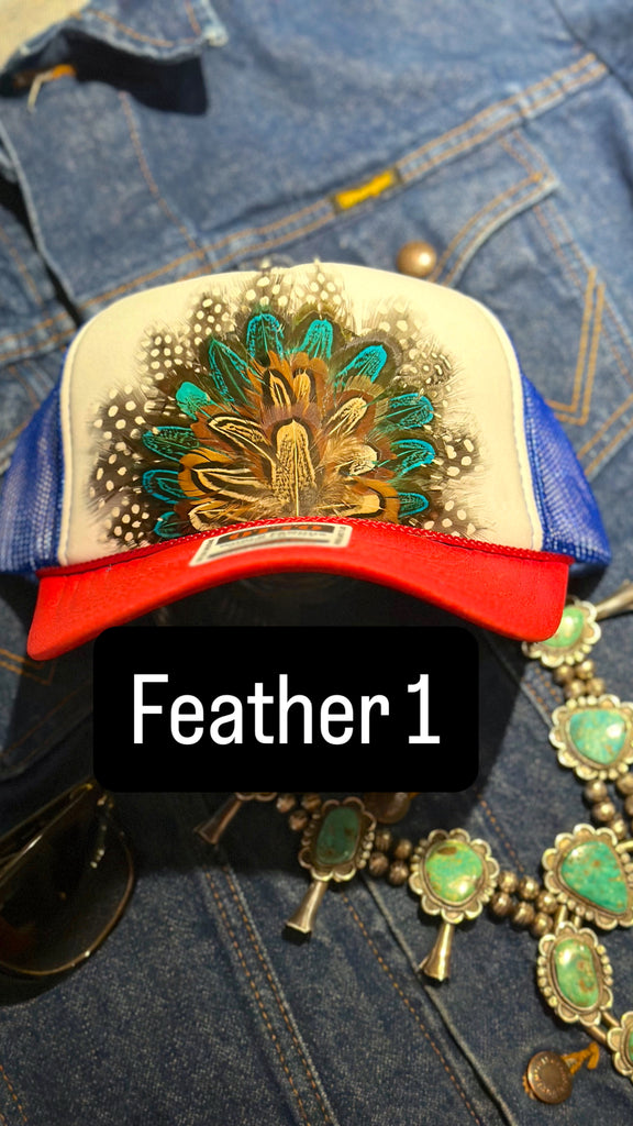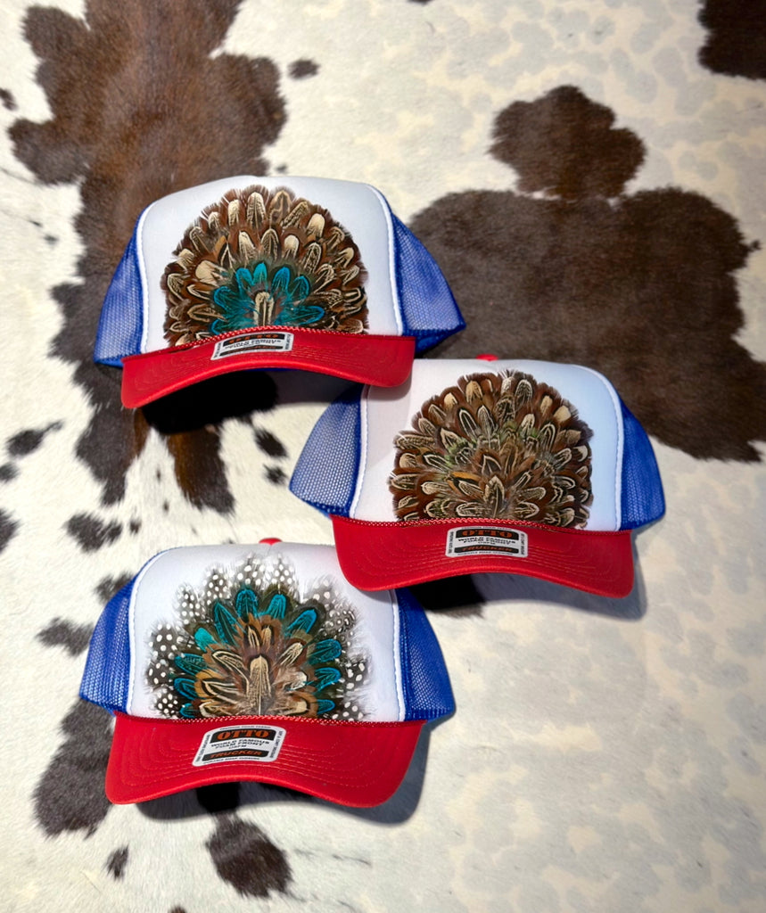RED WHITE AND BLUE FEATHER TRUCKER HAT